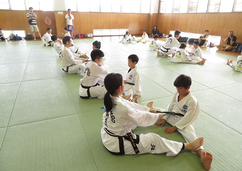 体が温まったところで2人1組の柔軟体操を行います。テコンドーの華麗な蹴りを身につけるには柔軟性が必須です。 最初は無理せず、徐々に体を柔らかくしていきましょう。
