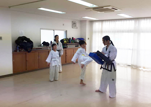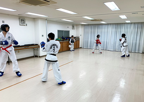 希望者は組手を行います。 手足、または顔面、胴などに防具をつけ安全性に配慮しています。 テコンドーの組手はライトコンタクトのポイント制で行われます。